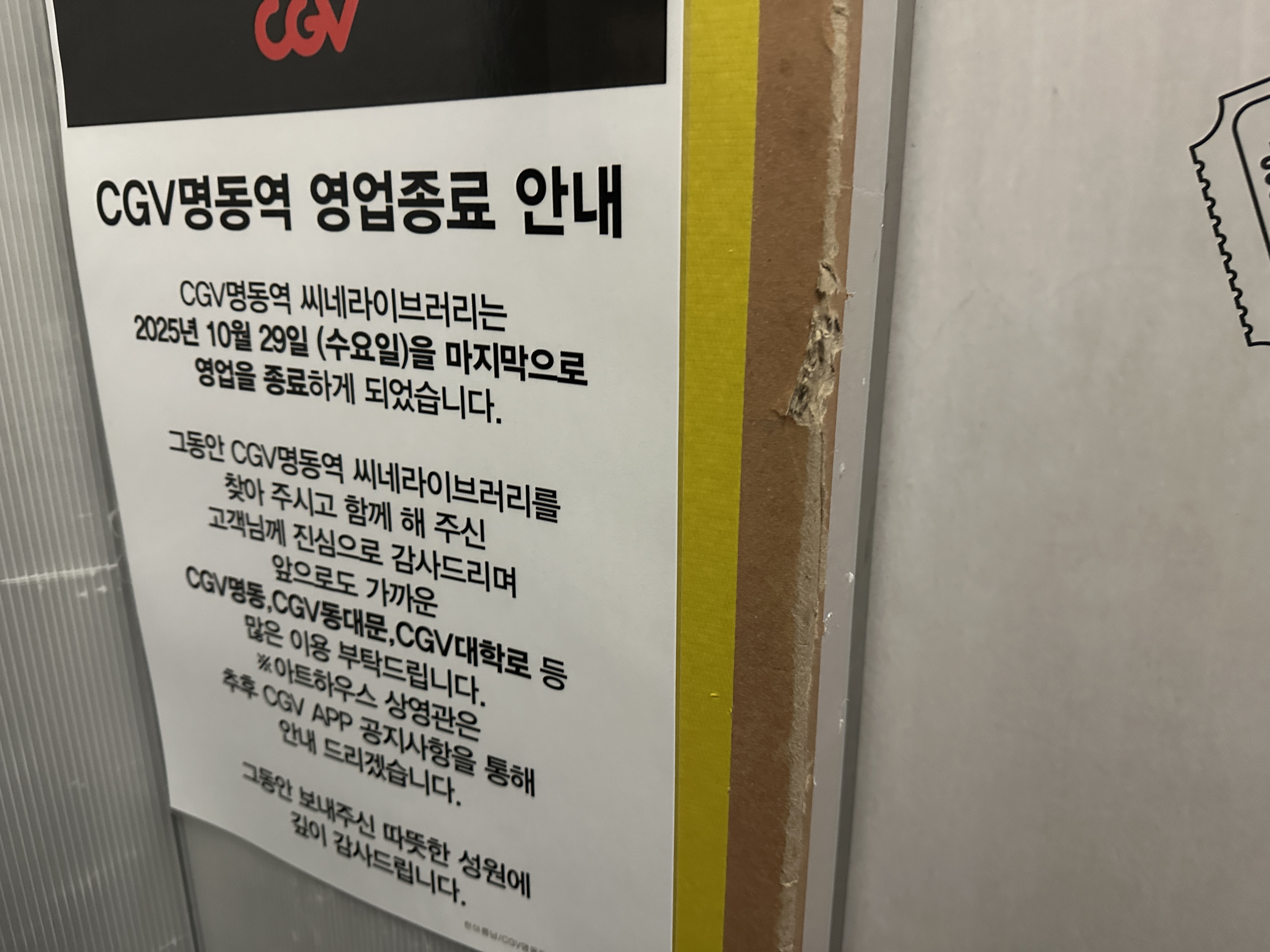 한편, 이번 관람은 개인적으로도 의미가 있었다. 이 상영관은 10월 29일을 마지막으로 문을 닫는다. 명동역 씨네라이브러리는 영화와 책, 그리고 기록의 공간이 공존하는 특별한 장소였다. 작품을 보고 나와 로비를 지나면서, 이곳이 곧 사라질 것이라는 사실이 묘하게 영화의 여운과 겹쳐졌다. 관계와 기억, 그리고 사라지는 것들에 대한 이야기였던 작품의 내용이 이 공간의 마지막 순간과 자연스럽게 맞물렸다. 어떤 공간은 단지 물리적 장소가 아니라, 시간을 담는 그릇이기도 하다는 생각이 들었다.